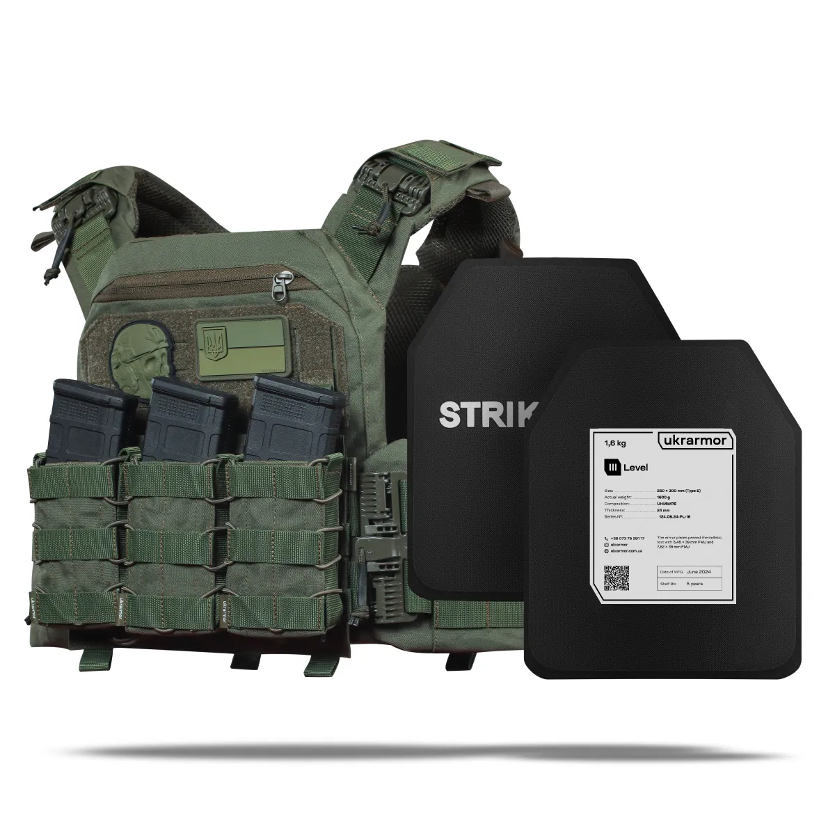 Один з найлегших та найбільш зручних варіантів бронежилета, що складається з 2 бронеплит 3 класу захисту та плитоноски (PRO) покращеної із системою швидкого скидання, супер м'якими підплічниками та матеріалу CORDURA 1000, що в сукупності захистить вас від пострілу від калібрів куль 5.45 х 39 мм. ПС та 7.62 х 39 мм. ПС.