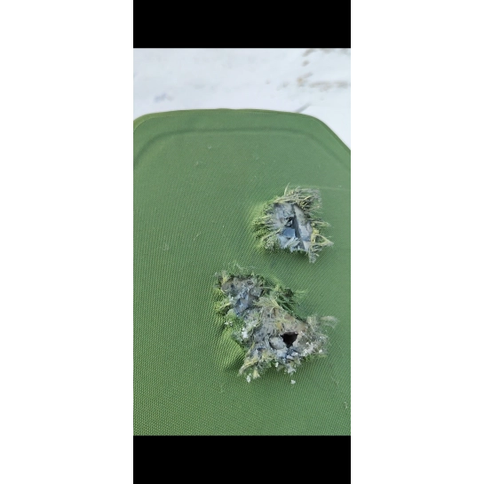 - Витримує кулюВитримує бронебійно-запальну кулю (Б-32) калібру 7,62×54 з гострокінцевою головною частиною, сталевим термозміцненим осердям у сталевій оболонці (вистріл з гвинтівки СВД з відстані 10м.). Та всі інші кулі класом нижче