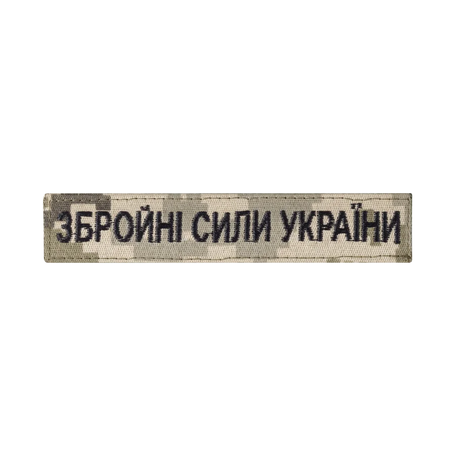 Нашивка Збройні сили України (чорна нитка, на липучці), 13 x 2.5 см. Піксель (мм-14)Невід’ємний елемент форми кожного військовослужбовця – нагрудна нашивка Збройні Сили України. Виріб повністю відповідає статутним вимогам і підходить до діючої військової форми.