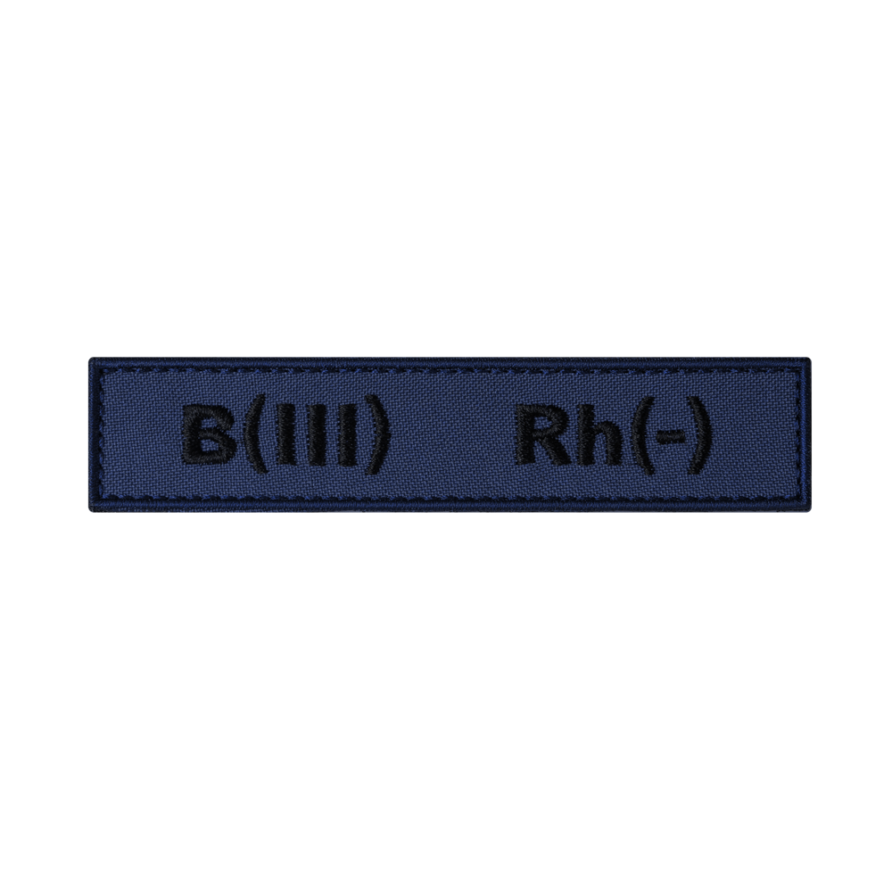 Шеврон (нашивка) група крові B(III) Rh(-), 2.5 х 12.5 см. Чорно-синійНагрудна нашивка із зазначенням групи крові, що використовується Збройними силами України. В умовах бойових дій найчастіше саме спеціальні нашивки з групою крові рятують життя військовослужбовця.