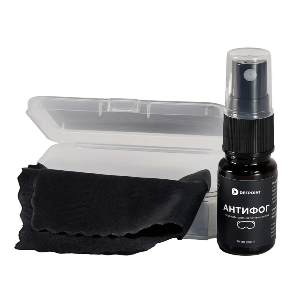 У комплекті: засіб Defpoint Anti-Fog (10 мл), серветка з мікрофібри, захисний пластиковий кейс.