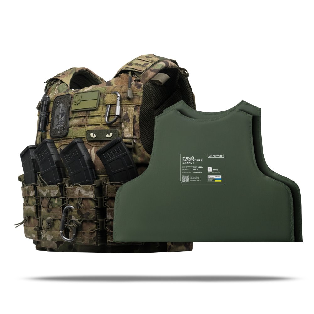 - КомплектаціяЗбільшена плитоноска та два балістичних пакети 620 на 470 мм., що покривають усю площу плитоноски