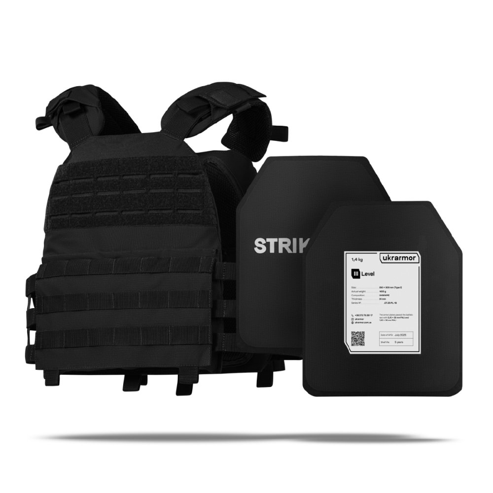 - 2 бронеплити 3-го класу з НВМПЕ (вага 1.4 кг) розміру 25х30 см;