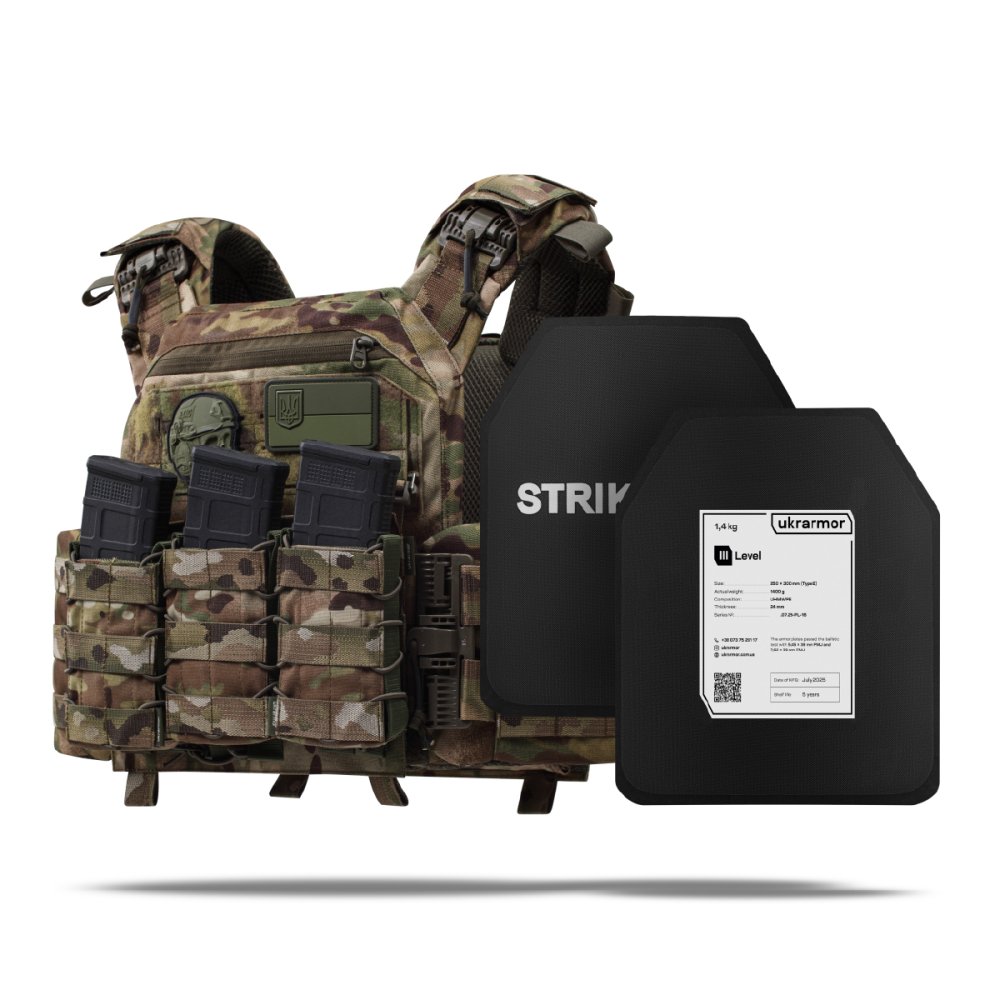- Комплектація2 бронеплити 3 класу (вага 1.6 кг, НВМПЕ), плитоноска покращена (PRO).