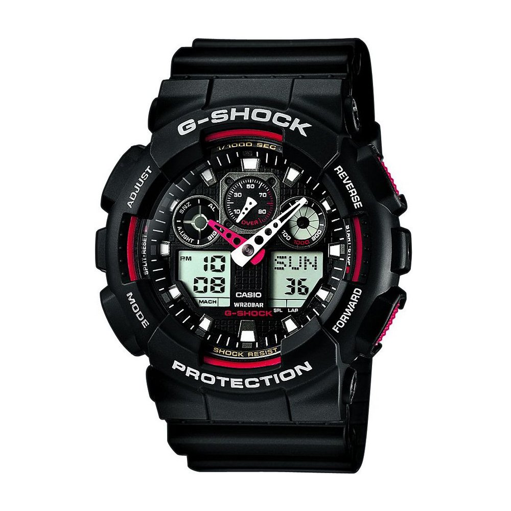 Годинник Casio G-Shock GA-100. Чорно-червонийЛегендарний японський годинник Casio G-Shock створений для тих, хто працює в екстремальних умовах — військових, рятувальників та інструкторів: ударостійкий корпус, захист від магнітних полів і водонепроникність до 20 бар дозволяють покладатися на прилад під час маневрів, занурень і польових виходів. Інтуїтивні функції (автопідсвічування, світовий час, таймери й секундомір з діапазоном до 100 годин) роблять його корисним інструментом у плануванні операцій, тренувань та щоденних задач.