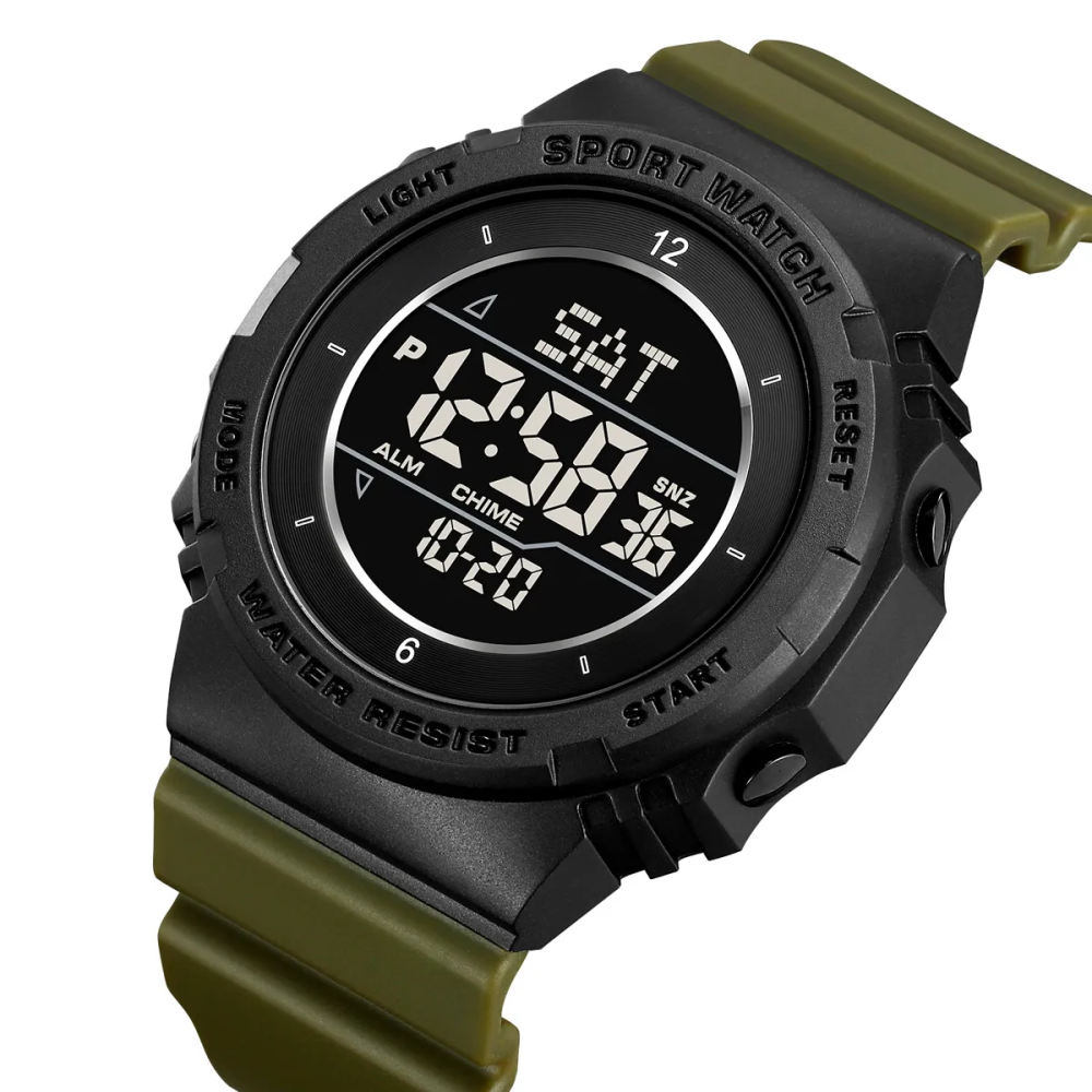 Надійний наручний чоловічий годинник у мілітарі стилі, розрахований на активне щоденне використання в міських, польових та тренувальних умовах. Модель оснащена практичним електронним набором функцій: секундоміром, будильником, таймером зворотного відліку та календарем. Зелений силіконовий ремінець у поєднанні з матовим чорним корпусом формує стриманий, але виразний образ, який органічно підходить для активного стилю життя.