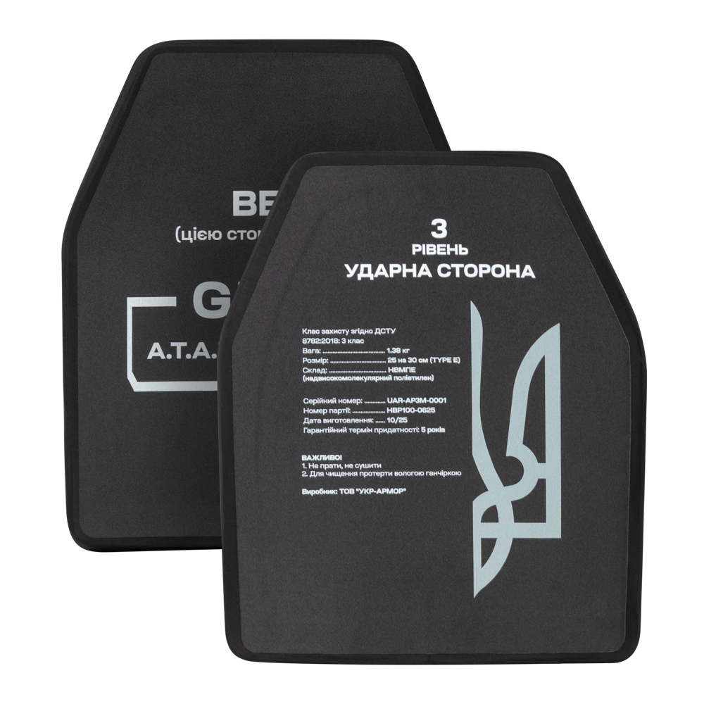 Один з найлегших варіантів бронезахисту (це важко уявити, але вага всього 1.38 кг. однієї плити). Надлегкі бронеплити 3 класу здатні захистити Вас від кулі 5.45 (якщо бути точним, то від 5,45 х 39 мм. ПС та 7,62 х 39 мм. ПС.) та найбільш розповсюдженого ушкодження — ураження уламками різної величини, шрапнелі та рикошетів.