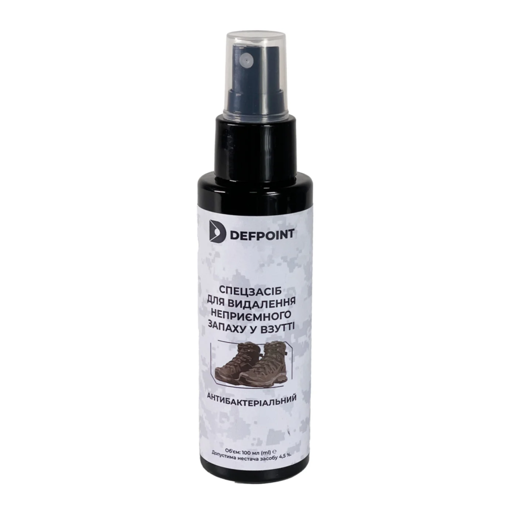 Спецзасіб для видалення неприємного запаху у взутті Defpoint (антибактеріальний), 100 млСпеціально розроблений антибактеріальний засіб для усунення неприємного запаху у взутті, створений з урахуванням потреб військових, рятувальників, співробітників спецпідрозділів, мисливців, туристів та всіх, хто регулярно перебуває у взутті тривалий час.