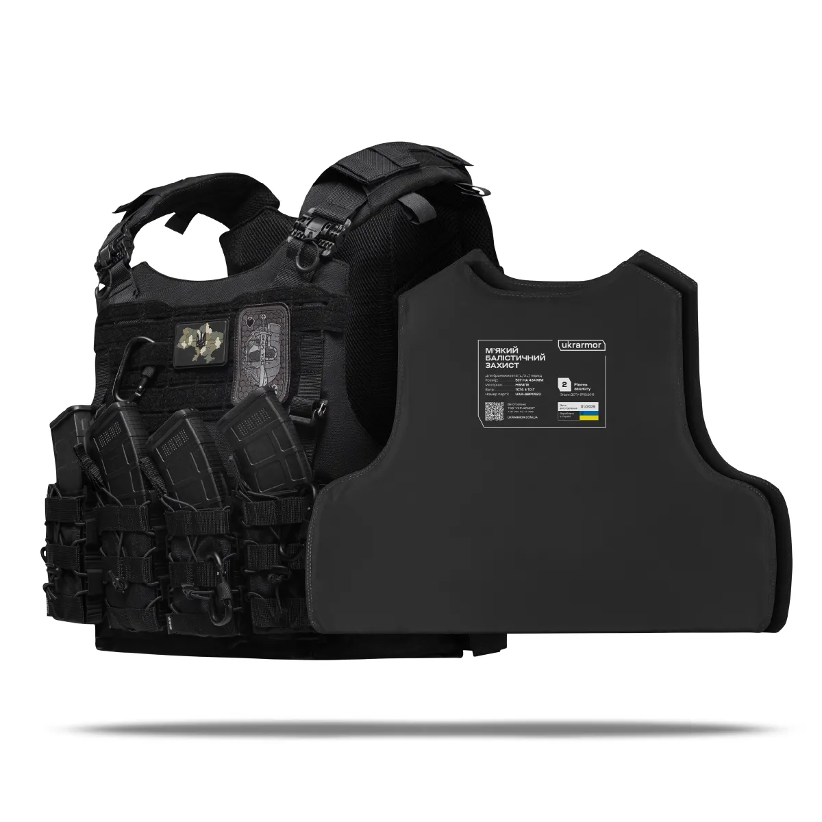 - КомплектацияУвеличенная плитоноска и два баллистических пакета 620 на 470 мм. покрывающих всю площадь плитоноски