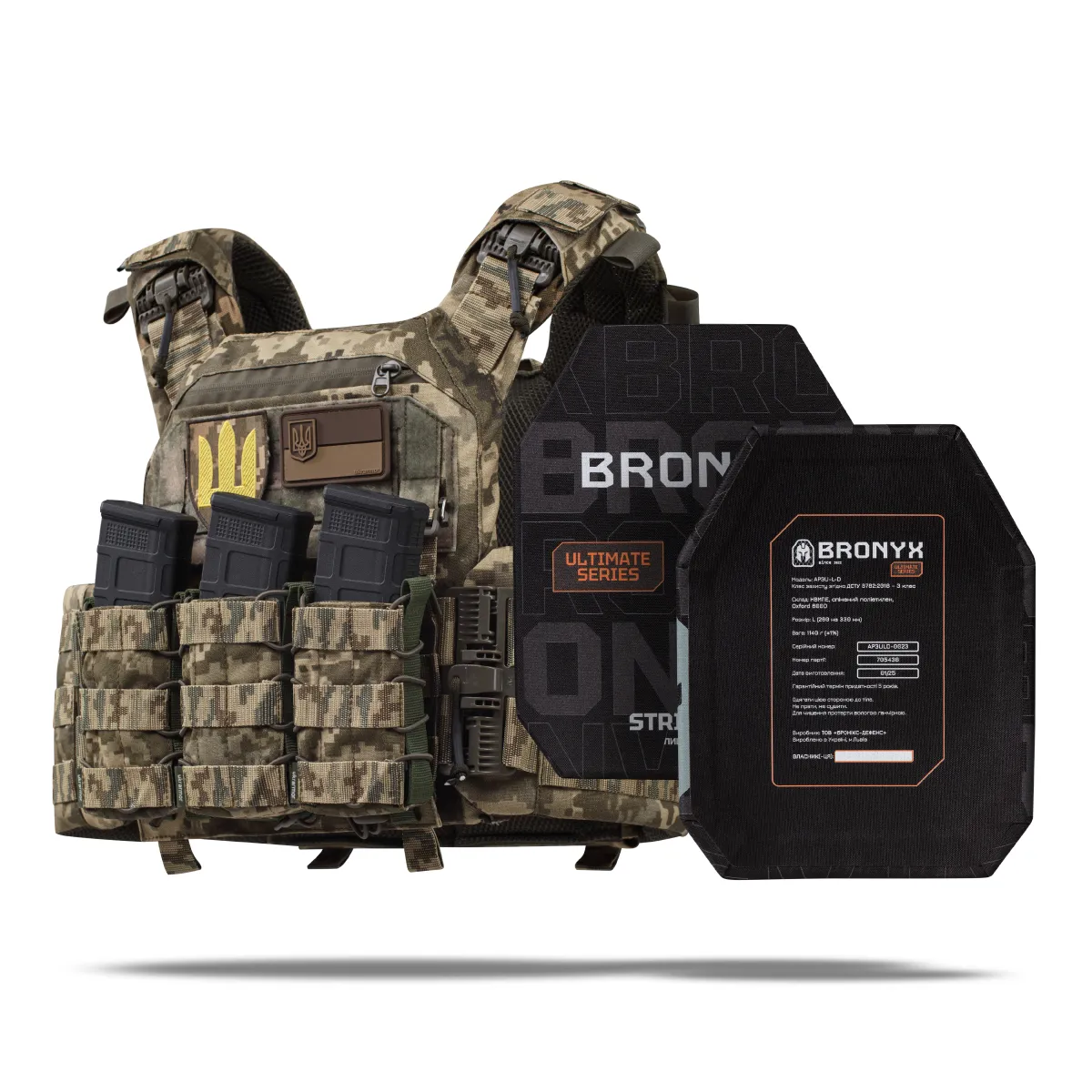 – 2 бронеплиты 3 класса Ultimate Bronyx (вес 1.14 кг, материал СВМПЭ (сверхвысокомолекулярный полиэтилен);