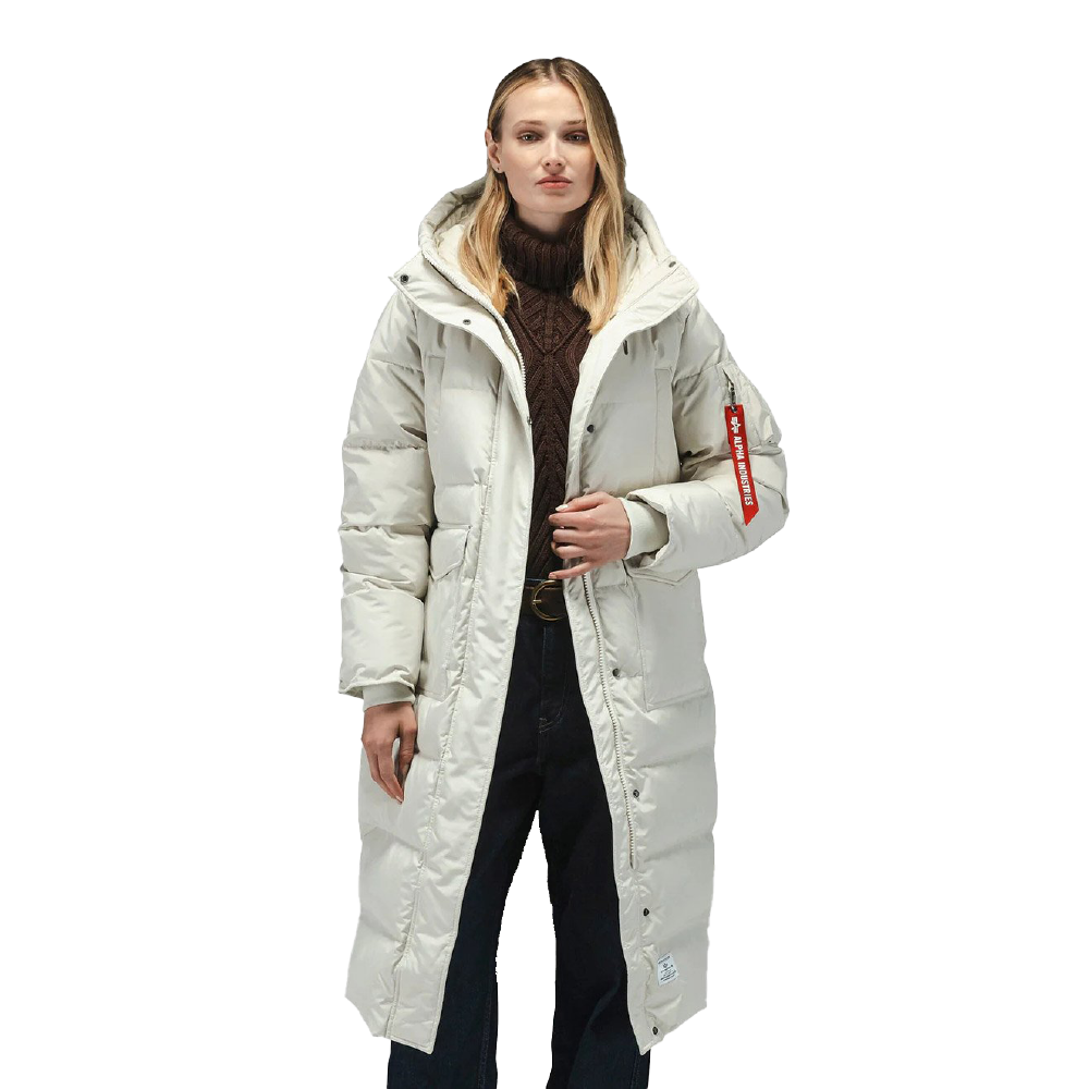 Куртка Alpha Industries Sierra Long Puffer Parka Womens. БелыйЗимняя женская парка Alpha Industries с выразительным силуэтом выполнена из влагостойкого полиэстера, эффективно защищающего от мокрого снега и холодного ветра. Утеплитель из натурального пуха 80/20 с сертификацией RDS обеспечивает стабильное тепло даже в сильный мороз, сохраняя легкость и комфорт в носке.