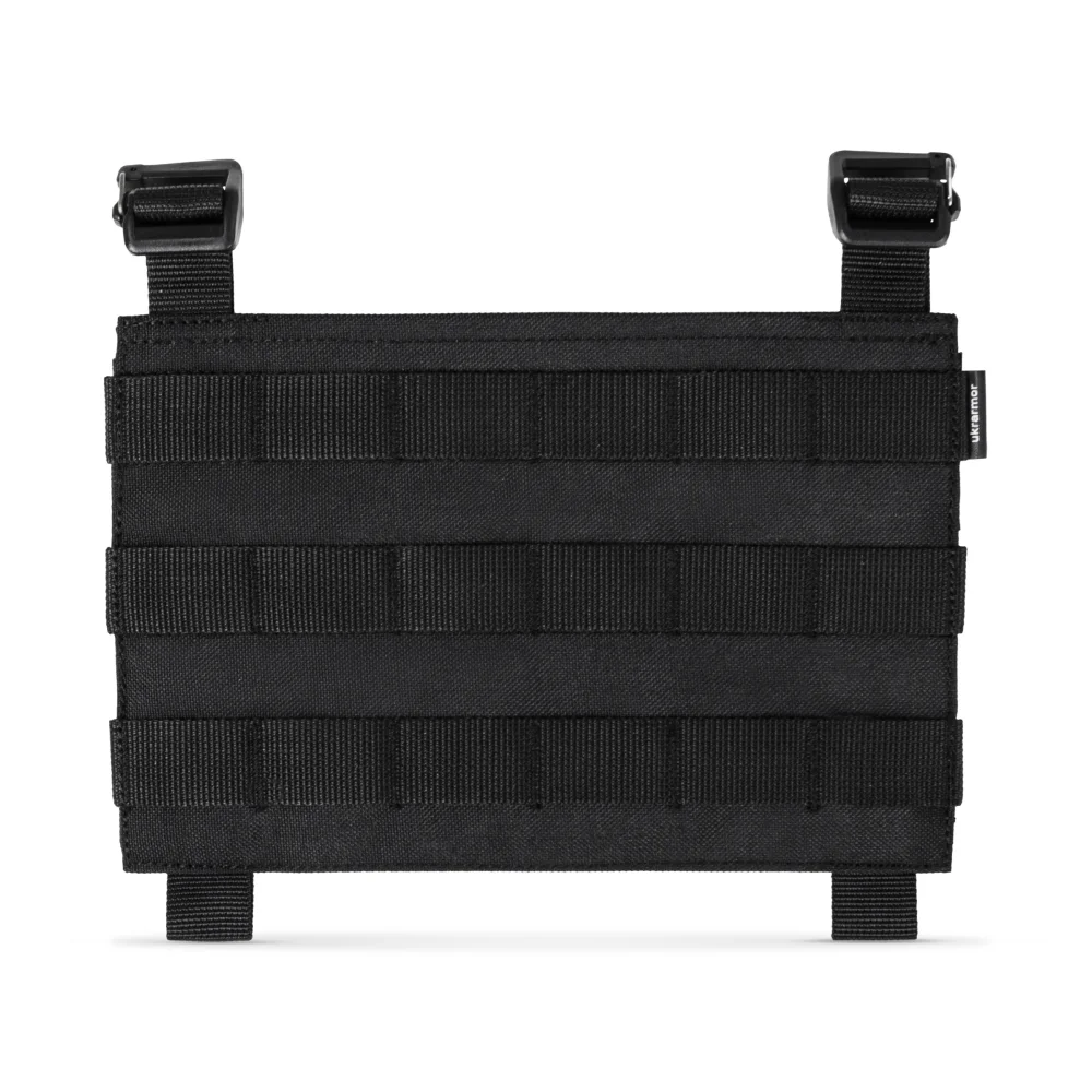 Сменная передняя панель на плитоноску улучшенную (PRO) от компании Ukrarmor (хотя может подойти на другие аналоговые плитоноски). Впереди прошита стропами MOLLE, что позволяет фиксировать на нее любое MOLLE совместное снаряжение. Изготовлена из прочного и износостойкого материала CORDURA 1000 и крепится на плитоноску стандартизированными креплениями, с помощью крючков Woojin и велкро липучки.